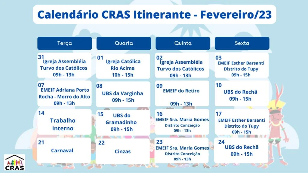 Orientações e Prestações de Serviços serão levados, no mês de fevereiro, por meio do CRAS Itinerante para os bairros rurais. A unidade móvel orienta as pessoas sobre transferência de renda, Bolsa Família, benefício de prestação continuada, inclusão e atualização do Cadastro Único, oficinas de qualificação profissional, visitas domiciliares de equipe da saúde, entre muitos outros benefícios.